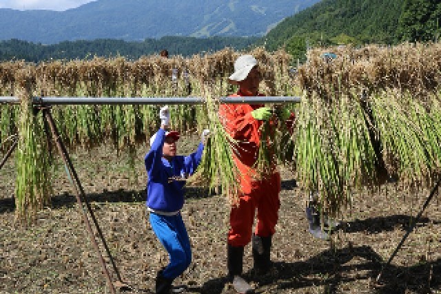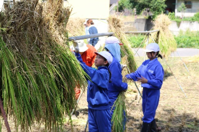 でも子どもたちは暑さに負けず、ザクザクと手際よく稲を刈りとりハゼにかけていました。