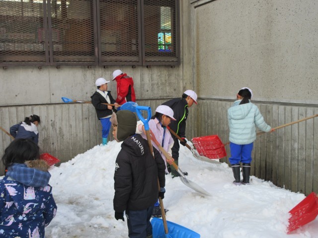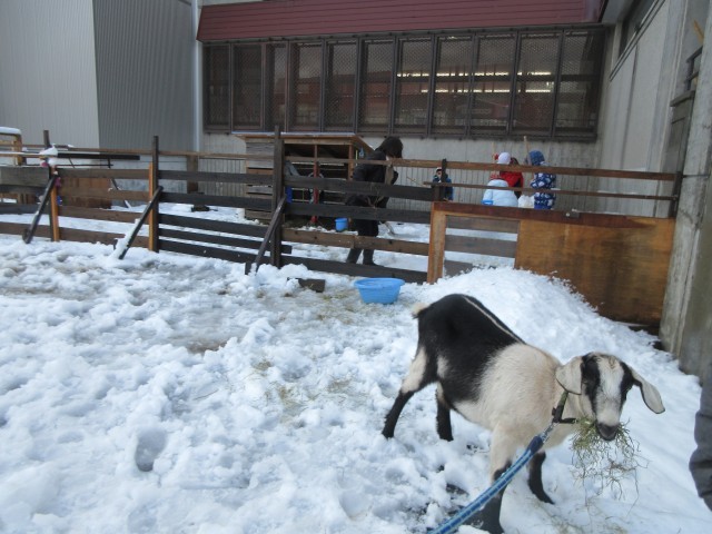 今日は野沢温泉の里に初雪が降りました。2年生の子どもたちは、生活科の時間で飼育しているヤギのフクちゃんの小屋の中を雪かきをしたり、雪山の遊び場を作ったりしました。フクちゃんにとって生まれて初めて見る雪景色!最初は少し戸惑っている様子でしたが、2年生が外から声をかけるとゆっくりとした足取りで雪を踏んで近寄ってきてくれました。高い場所が好きなフクちゃんは、2年生が作った雪山に乗って楽しんでいる様子でした。子どもたちもフクちゃんも雪が降って嬉しい1日になりました。