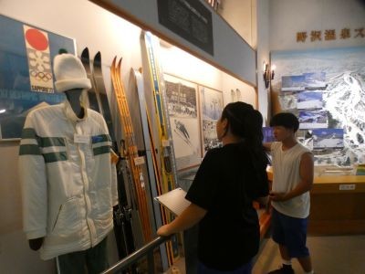今年から1年生は、毎年1月末に野沢温泉を訪れる千葉県・御宿中の1年生に、野沢温泉村のスキーのについて紹介することを目標に、学習を始めています。この日は、館長さんの案内を受けながら、自分が分担するコーナーについて調べたり、素材の写真を撮ったりしました。