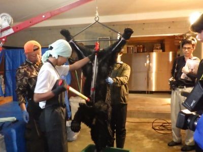 「地元の素材」グループは、昨年に続いてジビエ料理の体験の一つとして、地元猟友会の方に教えていただきながら、熊の解体にチャレンジしました。この熊は、この当日に偶然捕獲されたもので、生徒はその体や内臓のぬくもりを実際に感じながら、解体の体験をしました。